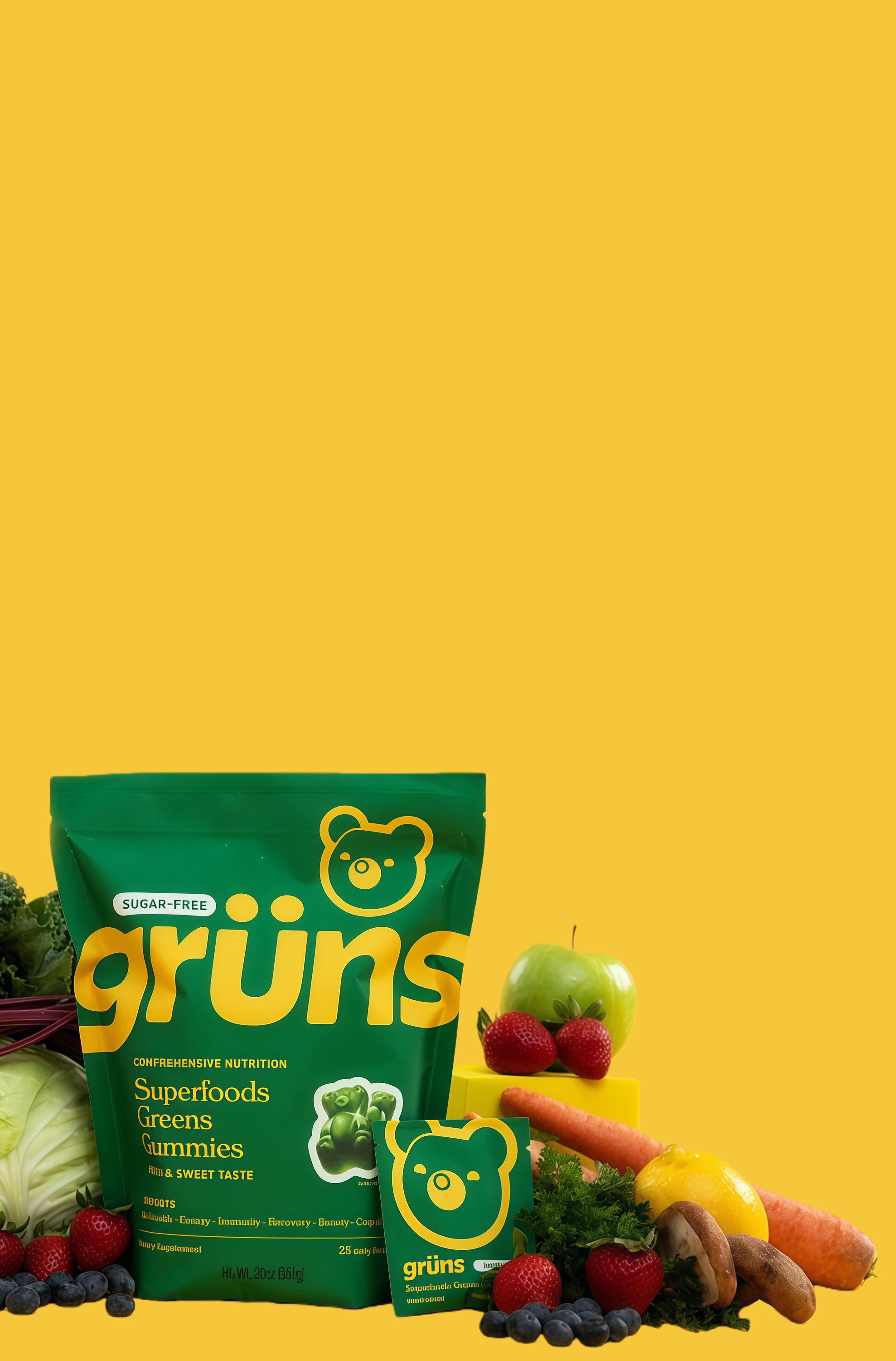 Grüns is formulated to help nutrient deficient people fill the nutrient gaps with our snackable, packable gummies. Enjoy the beary best way to get comprehensive nutrition and fill your nutrition gaps every day with Grüns!